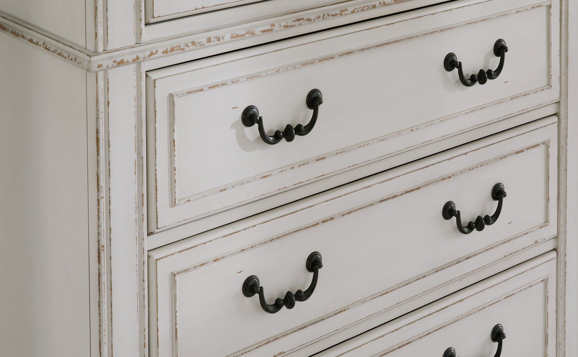 Traditional design. Casual appeal. You can have it all with this king upholstered panel bed. A relaxed chipped white finish and an inset headboard cushion with classic button tufting give the distinctive piece an allure all its own. And the low-profile side rails and footboard are on trend for today’s laid-back lifestyles.