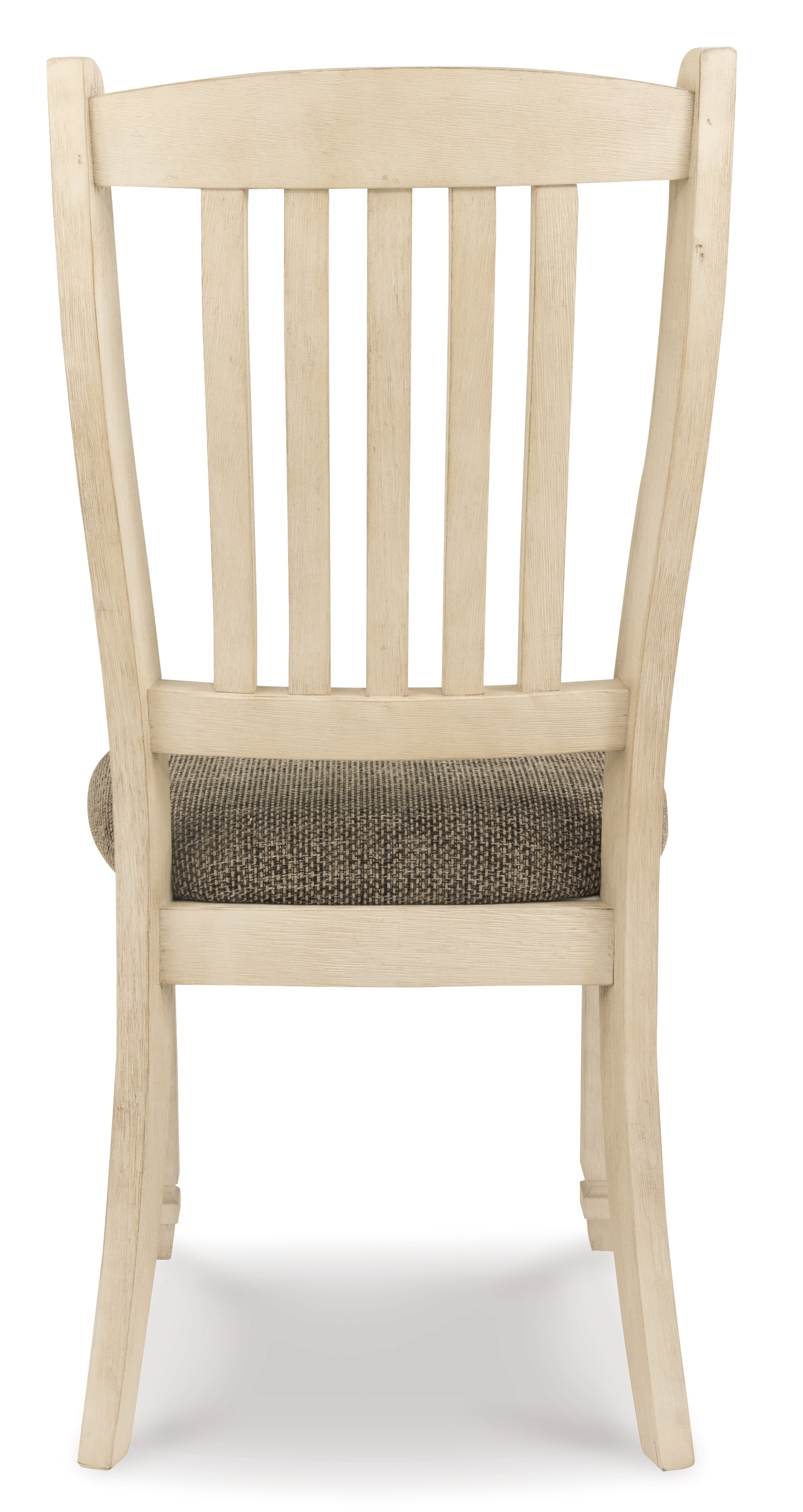 Dine in the comfort and rustic charm of this unique side chair with rake-back design. The cushioned seat, upholstered in a heavy woven fabric, is the perfect place to sit and linger. Textured antique white finish serves up a vintage look with ease.