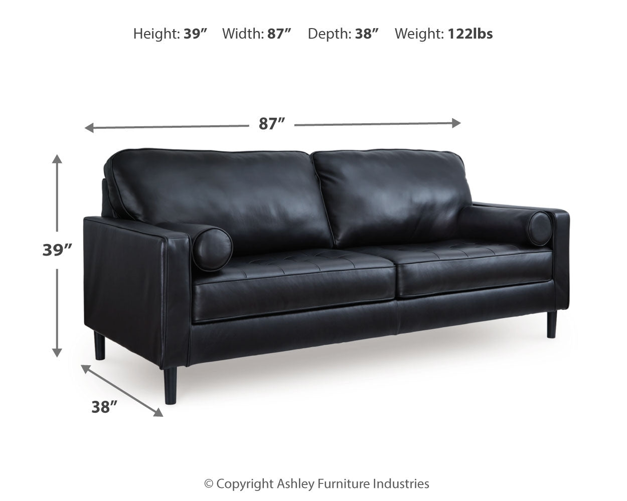 This loveseat embodies timeless mid-century elegance with its linear design, sleek track arms and tapered legs. Skillfully matched leather and faux leather upholstery adds a luxurious touch to the overall look. Experience endless style opportunities for today's living spaces.