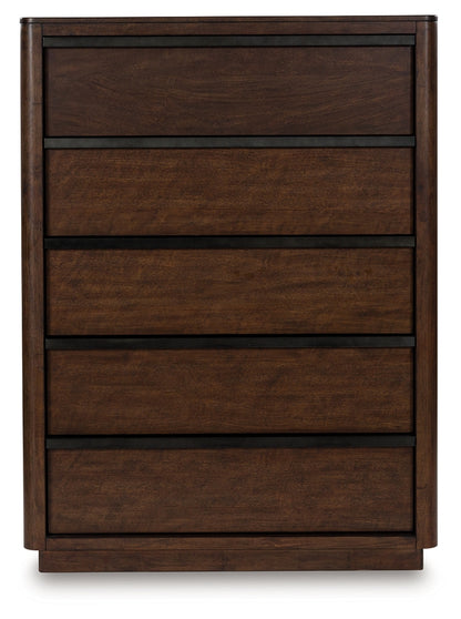 Casual contemporary styling with a decidedly modern vibe. This dresser is warm and inviting with a rich dark brown finish, adorning your restful retreat with on-trend elegance. Full-length metal pulls in a matte black finish add a subtly cool touch to spacious storage drawers. What a simply stunning way to achieve the bedroom of your dreams.