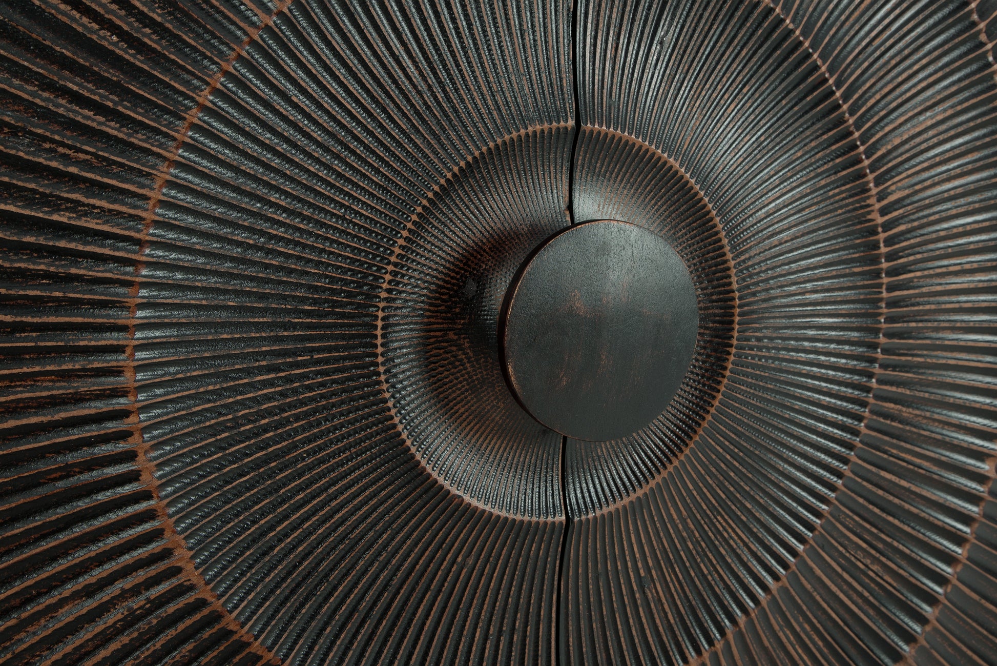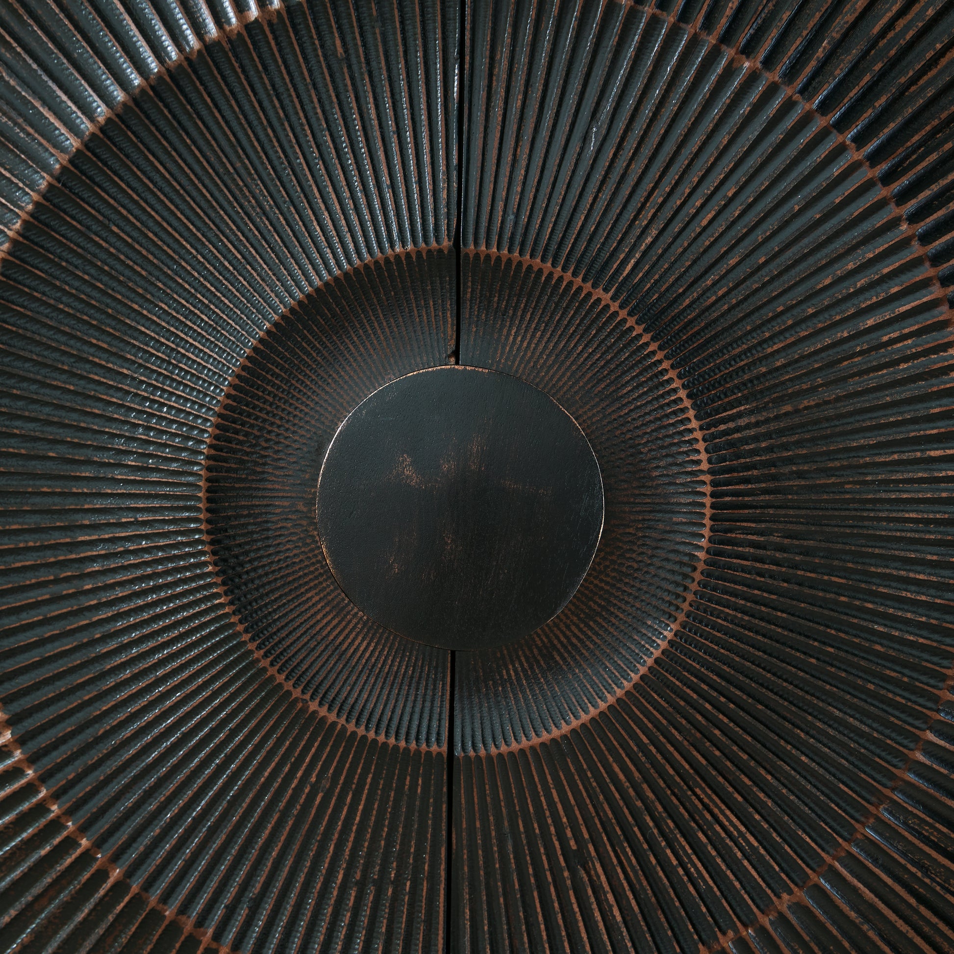 High style is on the rise with this wood accent cabinet. Its stunning doors, graced with a carved sunburst pattern and oversized wood pull, open to reveal two shelves. A distressed black finish adds contemporary flair. Whether this cabinet is accommodating storage needs or hiding clutter, it's truly a showpiece.