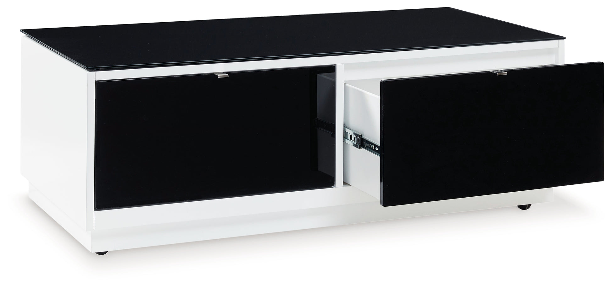 Combining a high-gloss white finish with a black glass tabletop, this coffee table proves opposites really do attract. It's the perfect blend of modern style and functionality, with two roomy drawers for storing essentials and a large open display shelf for decorative items. Want to rearrange the furniture? Casters make it easy to adapt to any situation.