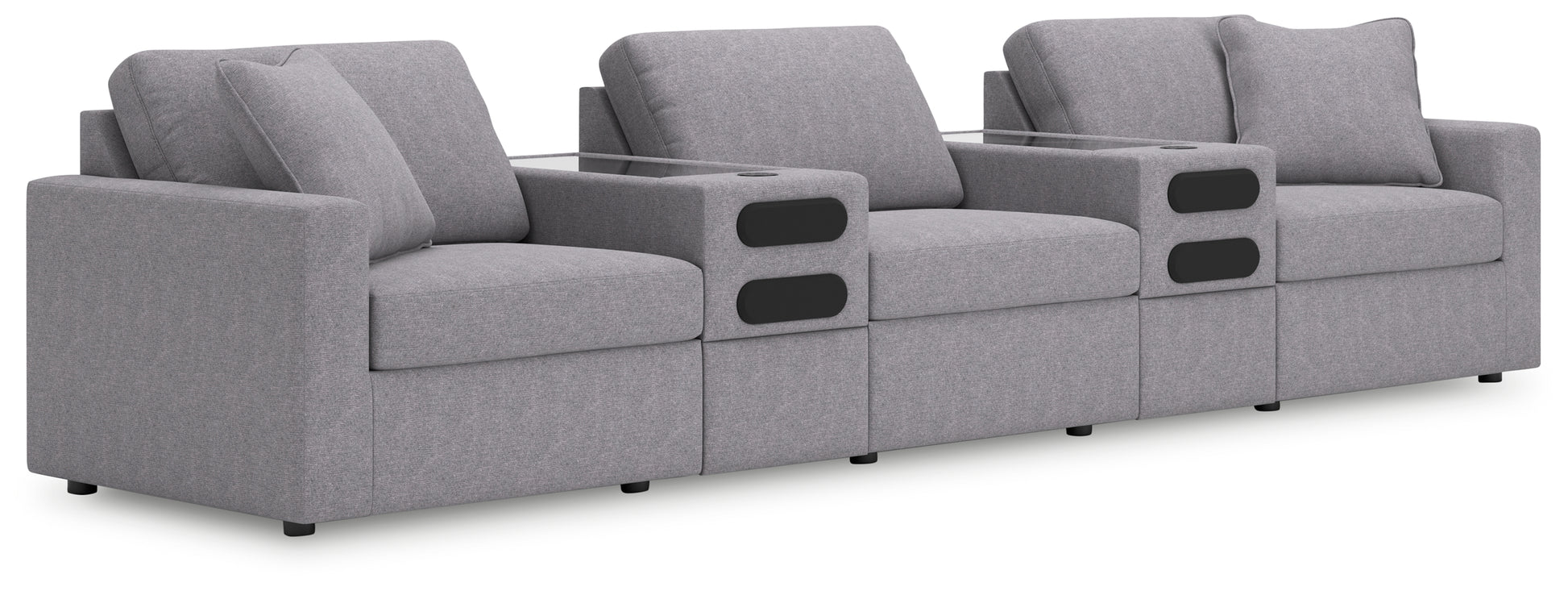 - Includes 7 modular pieces: left-arm facing corner chair, 2 armless chairs, 2 wedges, audio console with storage and right-arm facing corner chair