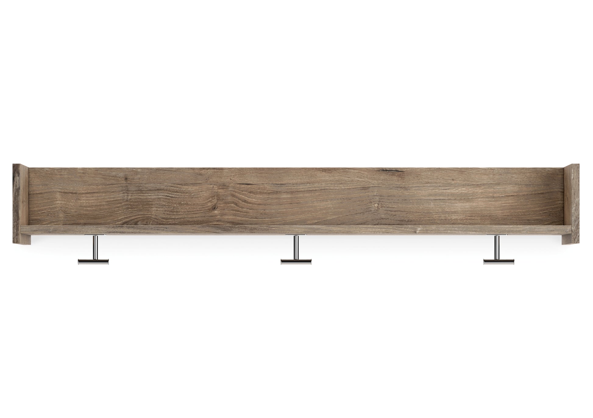 This stylish and versatile wall-mounted coat rack is an ideal addition to your entryway or mudroom. It features an open shelf for easy access or display. A dry, light finish with replicated oak grain is accented with three brushed nickel-tone hooks for hats and handbags. Wall mounting bracket included.