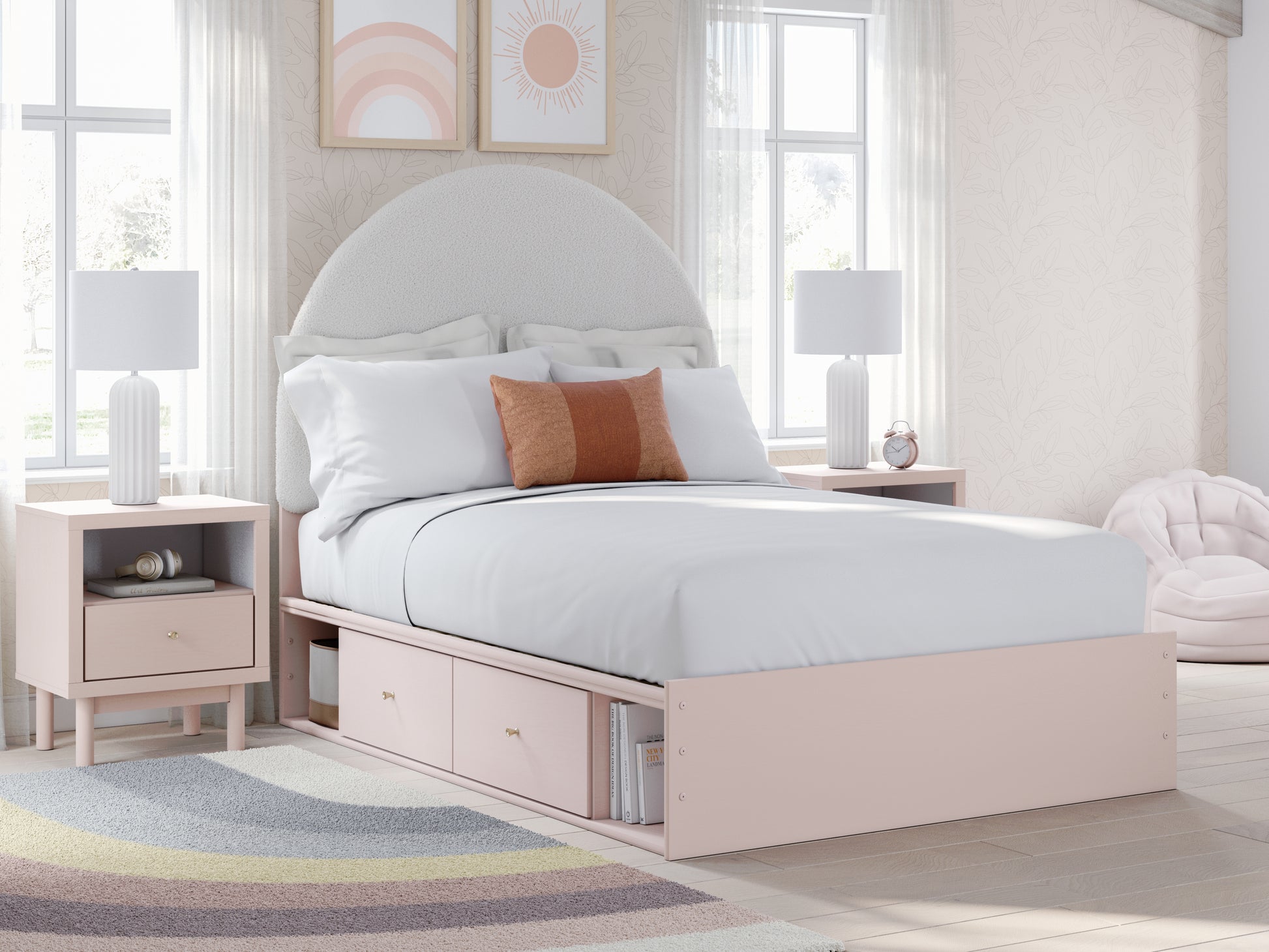 Pretty in pink. This twin upholstered panel bed with storage keeps the spirit of your home’s modern aesthetic while suiting all your young one’s needs. Its cozy-cute upholstery and subtle blush finish bring a playful, charming vibe to bedtime. Made for her and styled for you, it’s a lovely addition to a beautifully chic child’s bedroom.